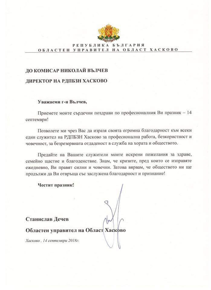 По този повод областният управител на област Хасково г-н Станислав Дечев изпрати поздравителен адрес до директора на РДПБЗН комисар Николай Вълчев, в който се казва: